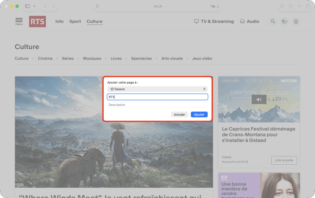 4. Dans la fenêtre qui s’ouvre au centre, assurez-vous que le site soit ajouté aux Favoris puis donnez un nom à ce site internet et cliquez sur Ajouter
